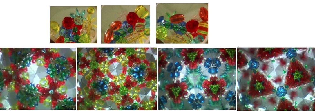 De samme enkeltelementer skifter plass «vilkårlig» når man vrir kaleidoskopet. Resultat er helt ulike mønster med de samme elementer. Du må kunne tenke ut av boksen.