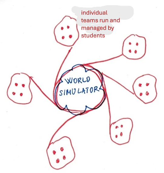 The simulator" world " is based on artificial intelligence, (or what is available of technology) and integrates information in a dependency index with other info. That is, if something changes it has consequences for other things. (written in 2021, before I learned about the IA) The simulator consists of as many factors as possible in interaction, but it only communicates what you need to learn and relate to. I. e students need to learn segmenting their work. Training focus.